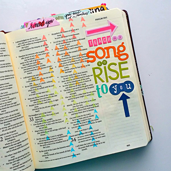 A few weeks ago when the IF Creative Team was officially announced here on the Illustrated Faith blog you may have noticed that my picture included a microphone and that all of my favorite journaling verses listed were Psalms. Guys, I am a music lover and Christian Worship Music is a huge passion of mine. There are many song lyrics illustrated in my Bible! This week, the song “I Need You” by Matt Maher is playing on repeat in my heart. In the bridge are these beautiful lyrics “Teach my song to rise to you”. Oh, friends, is this ever my fervent prayer! Yes, I am a music lover and a vocalist but these words mean so very much more!