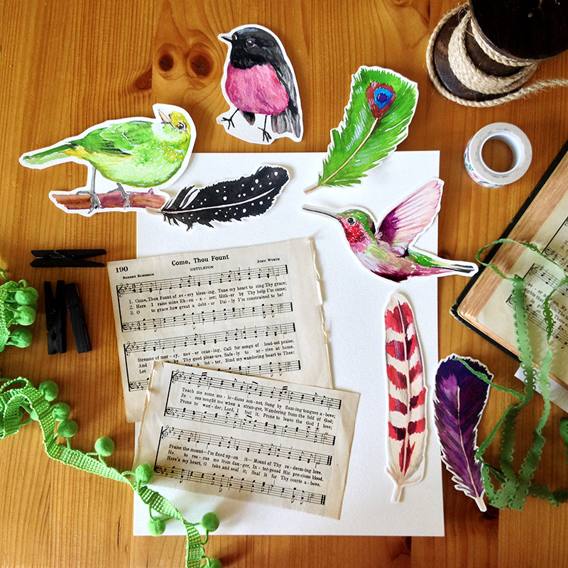 I started with an 8” x 10” piece of watercolor paper and covered it with pretty colors. Then mounted the hymn pages to it with washi tape.